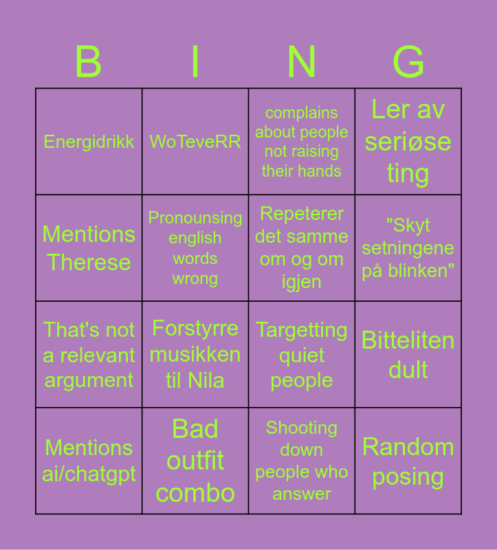 This bingo card has 16 words: Bad outfit combo, Bitteliten dult, complains about people not raising their hands, Energidrikk, That's not a relevant argument, WoTeveRR, Targetting quiet people, Shooting down people who answer, Mentions Therese, Pronounsing english words wrong, Mentions ai/chatgpt, Ler av seriøse ting, Forstyrre musikken til Nila, "Skyt setningene på blinken", Repeterer det samme om og om igjen and Random posing.