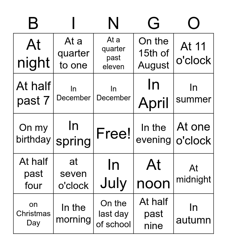 This bingo card has a free space and 24 words: at seven o'clock, In the morning, In December, on Christmas Day, At 11 o'clock, At night, At half past 7, At a quarter to one, In the evening, In July, In April, On my birthday, At noon, At midnight, In December, At half past nine, At one o'clock, At a quarter past eleven, In summer, In spring, In autumn, At half past four, On the 15th of August and On the last day of school.