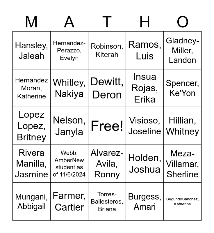This bingo card has a free space and 26 words: Alvarez-Avila, Ronny, Burgess, Amari, Dewitt, Deron, Farmer, Cartier, Gladney-Miller, Landon, Hansley, Jaleah, Hernandez Moran, Katherine, Hernandez-Perazzo, Evelyn, Hillian, Whitney, Holden, Joshua, Insua Rojas, Erika, Lopez Lopez, Britney, Meza-Villamar, Sherline, Mungani, Abbigail, Nelson, Janyla, Pulley, Keniyah, Ramos, Luis, Rivera Manilla, Jasmine, Robinson, Kiterah, SegundoSanchez, Katherine, Spencer, Ke'Yon, Torres-Ballesteros, Briana, Visioso, Joseline, Webb, AmberNew student as of 11/6/2024, Whitley, Nakiya and Yat-Cerritos, Christopher.
