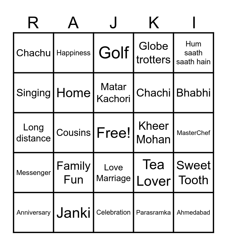 This bingo card has a free space and 49 words: Kolkata, Ahmedabad, Bhojnagarwala, Celebration, Family Fun, Laughter, Happiness, Dancing, Singing, Love, Home, Globe trotters, Sweet Tooth, Tea Lover, Puchka, Churan, Matar Kachori, Kheer Mohan, Dil Kasar, Hum saath saath hain, Cousins, Parasramka, Chachu, Chachi, Bhaiya, Bhabhi, Anniversary, 25th, Love Marriage, Messenger, Lovebirds, Silver Jubilee, Painting, Art and craft, Janki, Rajat, Together forever, South Africa, MasterChef, Cadbury, Foodie, December, 1999, 2024, Long distance, Golf, CSC, RCGC and Dobby.