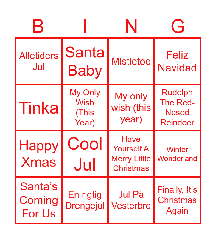 This bingo card has 57 words: Jesus og Josefine, All I want for Christmas, Shake up Christmas, Alletiders Jul, Det er risengrød, Jul på Vesterbro, My only wish (this year), Den Himmelblå, Happy Xmas, Finally it’s Christmas Again, Feliz Navidad, Lokes Rapsody, Last Christmas, Tuborg Julebryg Jingle, Let Love Be love, It’s Beginning to look a lot like Christmas, Tinka, Winter Wonderland, Koldt udenfor, Santa’s Coming For Us, En rigtig Drengejul, Bring Me love, Nu er det Jul (Burhan G), Mistletoe, Thank God It’s Christmas, Rudolph The Red-Nosed Reindeer, Driving Home For Christmas, Merry Christmas Everyone, Cool Jul, All I Want For Christmas, Let It Snow! Let It Snow!, Der er noget i december, Jul Det’ Cool,, Jul I Angora, Jul På Vesterbro, My Only Wish (This Year), Santa Tell Me, Have Yourself A Merry Little Christmas, Happy Xmas (War Is Over), Finally, It’s Christmas Again, Santa Baby, Santa Claus Is Coming To Town, A Holly Jolly Christmas, Søren Banjomus, Underneath The Tree, Lille Store Verden, It’s Beginning To Look A Lot Like Christmas, It’s Hard To Be A Nissemand, Når Sneen Falder, Guld Jul, Koldt Udenfor, En Rigtig Drengejul, The Støvle Dance, Rockin' Around The Christmas Tree, Jinge Bell Roc, Do They Know It Christmas and Jul i valhal.