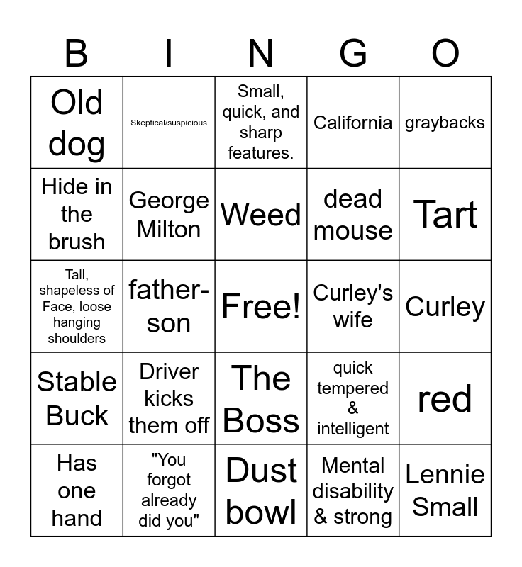 This bingo card has a free space and 24 words: Driver kicks them off, "You forgot already did you", Weed, Has one hand, graybacks, Old dog, Hide in the brush, Skeptical/suspicious, Curley's wife, The Boss, dead mouse, Tall, shapeless of Face, loose hanging shoulders, quick tempered & intelligent, red, George Milton, Mental disability & strong, Curley, Small, quick, and sharp features., Tart, father-son, Lennie Small, Stable Buck, California and Dust bowl.