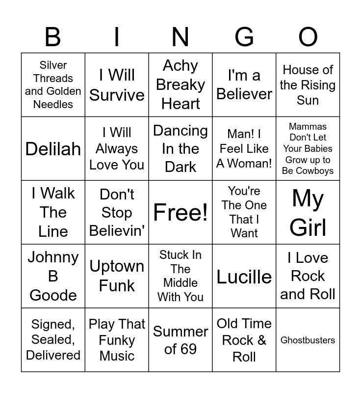 This bingo card has a free space and 76 words: 500 Miles, Teenager In Love, Achy Breaky Heart, All Shook Up, Aquarius, Born To Be Wild, Brown Eyed Girl, California Dreamin, Chain Gang, Cold, Cold Heart, Complicated, Crocodile Rock, Dancing In the Dark, Delilah, Diana, Don't Stop Believin', Footloose, Ghostbusters, Happy Together, House of the Rising Sun, I Heard It Through The Grapevine, I Walk The Line, I Will Always Love You, I Will Survive, I'm a Believer, It's My Life, Jumpin' Jack Flash, King Of The Road, Lay Down Sally, Let Me Be There, Let's Twist Again, Like a Rolling Stone, Long Tall Sally, Lucille, Mammas Don't Let Your Babies Grow up to Be Cowboys, Man! I Feel Like A Woman!, Margaritaville, Me and Bobby McGee, My Girl, Old Time Rock & Roll, On A Bicycle Built For Two, Respect, Rockstar, Run To You, Shake, Rattle And Roll, Shakin' All Over, Signed, Sealed, Delivered, Silver Threads and Golden Needles, Single Ladies, Sixteen Tons, Stayin' Alive, Stuck In The Middle With You, Sundown, Sweet Caroline, Sweet Home Alabama, Thank God I'm a Country Boy, The Sound of Silence, These Boots Are Made for Walkin', Ticket To Ride, Time Warp, Uptown Funk, We Didn't Start the Fire, What A Wonderful World, Y.M.C.A., You Can't Hurry Love, You're So Vain, You're The One That I Want, Drift Away, Hit Me With Your Best Shot, Hockey Song, I Love Rock and Roll, Johnny B Goode, Play That Funky Music, Stand By Me, Summer of 69 and Drift Away.