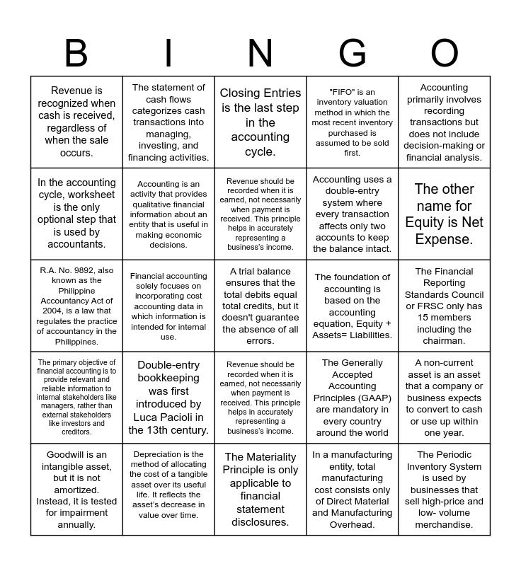 This bingo card has a free space and 24 words: Double-entry bookkeeping was first introduced by Luca Pacioli in the 13th century., Depreciation is the method of allocating the cost of a tangible asset over its useful life. It reflects the asset’s decrease in value over time., Revenue should be recorded when it is earned, not necessarily when payment is received. This principle helps in accurately representing a business’s income., Goodwill is an intangible asset, but it is not amortized. Instead, it is tested for impairment annually., Accounting primarily involves recording transactions but does not include decision-making or financial analysis., Revenue is recognized when cash is received, regardless of when the sale occurs., In the accounting cycle, worksheet is the only optional step that is used by accountants., The statement of cash flows categorizes cash transactions into managing, investing, and financing activities., The foundation of accounting is based on the accounting equation, Equity + Assets= Liabilities., Revenue should be recorded when it is earned, not necessarily when payment is received. This principle helps in accurately representing a business’s income., Accounting uses a double-entry system where every transaction affects only two accounts to keep the balance intact., R.A. No. 9892, also known as the Philippine Accountancy Act of 2004, is a law that regulates the practice of accountancy in the Philippines., The Generally Accepted Accounting Principles (GAAP) are mandatory in every country around the world, A non-current asset is an asset that a company or business expects to convert to cash or use up within one year., Accounting is an activity that provides qualitative financial information about an entity that is useful in making economic decisions., In a manufacturing entity, total manufacturing cost consists only of Direct Material and Manufacturing Overhead., The Financial Reporting Standards Council or FRSC only has 15 members including the chairman., Closing Entries is the last step in the accounting cycle., The other name for Equity is Net Expense., Financial accounting solely focuses on incorporating cost accounting data in which information is intended for internal use., The Periodic Inventory System is used by businesses that sell high-price and low- volume merchandise., The primary objective of financial accounting is to provide relevant and reliable information to internal stakeholders like managers, rather than external stakeholders like investors and creditors., "FIFO" is an inventory valuation method in which the most recent inventory purchased is assumed to be sold first. and The Materiality Principle is only applicable to financial statement disclosures..