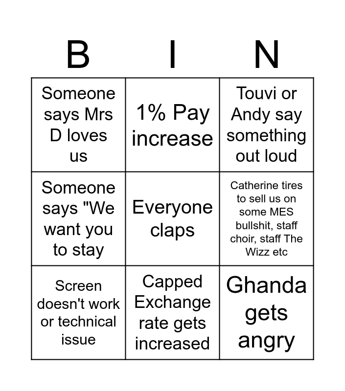 This bingo card has 12 words: Free!, Ghanda gets angry, Everyone claps, Catherine tires to sell us on some MES bullshit, staff choir, staff The Wizz etc, 1% Pay increase, Touvi or Andy say something out loud, Capped Exchange rate gets increased, A new 65%/35% split, Someone says Mrs D loves us, Someone says "We want you to stay, Screen doesn't work or technical issue and Any SLT are wearing their MES Letterman Jacket.