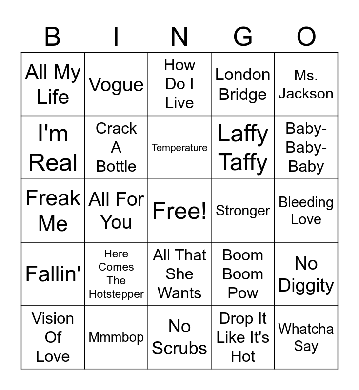 This bingo card has a free space and 213 words: One Sweet Day, Macarena, Un-Break My Heart, End Of The Road, I Will Always Love You, The Boy Is Mine, I Swear, I'll Be Missing You, The Sign, How Do I Live, Gangsta's Paradise, On Bended Knee, Fantasy, Too Close, That's The Way Love Goes, Because You Loved Me, Waterfalls, Creep, Can't Help Falling In Love, Jump, Take A Bow, This Is How We Do It, Baby Got Back, Believe, Freak Me, No Scrubs, You're Still The One, Wannabe, No Diggity, (Everything I Do) I Do It For You, Livin' La Vida Loca, Black Or White, I'd Do Anything For Love, Smooth, Stay (I Missed You)Genie In A Bottle, Whoomp! (There It Is), You Make Me Wanna, If You Had My Love, Save The Best For Last, Always Be My Baby, I'm Your Angel, Another Night, Hero, Have You Ever Really Loved, Again, Mmmbop, Kiss From A Rose, Weak, Angel Of Mine, Truly Madly Deeply, Rush Rush, Here Comes The Hotstepper, If I Ever Fall In Love, Let It Flow, All For Love, All That She Wants, I Love You Always Forever, Because I Love You (The Postman Song), I Don't Want To Miss A Thing, Together Again, Nice & Slow, Unpretty, It's All Coming Back To Me Now, Baby One More Time, I'm Too Sexy, Baby-Baby-Baby, My Way, Nothing Compares 2 U, Don't Let Go (Love), Lately, Mo Money Mo Problems, Quit Playing Games (With My Heart), I Believe I Can Fly, Hypnotize, Twisted, To Be With You, Vision Of Love, Rump Shaker, Vogue, All 4 Love, Nuthin' But A "G" Thang, I'll Be There, How Do You Want It, California Love, All My Life, What A Girl Wants, I Knew I Loved You, Thank God I Found You, Amazed, Say My Name, Maria Maria, Try Again, Be With You, Everything You Want, Bent, It's Gonna Be Me, Incomplete, Doesn't Really Matter, Music, Come On Over Baby (All I Want Is You), With Arms Wide Open, Independent Women, It Wasn't Me, Ms. Jackson, Stutter, Butterfly, Angel, All For You, Lady Marmalade, U Remind Me, Bootylicious, Fallin', I'm Real, Family Affair, U Got It Bad, How You Remind Me, Always On Time, Ain't It Funny, Foolish, Hot In Herre, Dilemma, A Moment Like This, Lose Yourself, Bump, Bump, Bump, All I Have, In Da Club, Get Busy, 21 Questions, This Is The Night, Crazy In Love, Shake Ya Tailfeather, Baby Boy, Stand Up, Hey Ya!, The Way You Move, Slow Jamz, Yeah!, Burn, I Believe, Confessions Part Ii, Slow Motion, Lean Back, Goodies, My Boo, Drop It Like It's Hot, Let Me Love You, Candy Shop, Hollaback Girl, We Belong Together, Inside Your Heaven, Gold Digger, Run It, Don't Forget About Us, Laffy Taffy, Grillz, Check On It, You're Beautiful, So Sick, Temperature, Bad Day, Sos, Ridin, Hips Don't Lie, Do I Make You Proud, Promiscuous, London Bridge, Sexyback, Money Maker, My Love, I Wanna Love You, Irreplaceable, Say It Right, What Goes Around... Comes Around, This Is Why I'm Hot, Glamorous, Don't Matter, Give It To Me, Girlfriend, Makes Me Wonder, Buy U A Drank (Shawty Snappin'), Umbrella, Hey There Delilah, Beautiful Girls, Big Girls Don't Cry, Crank That (Soulja Boy), Stronger, Kiss Kiss, No One, Low, Love In This Club, Bleeding Love, Touch My Body, Lollipop, Take A Bow, Viva La Vida, I Kissed A Girl, Disturbia, Whatever You Like, So What, Live Your Life, Womanizer, Single Ladies (Put A Ring On It), Just Dance, My Life Would Suck Without You, Crack A Bottle, Right Round, Poker Face, Boom Boom Pow, I Gotta Feeling, Down, Fireflies, Whatcha Say and Empire State Of Mind.