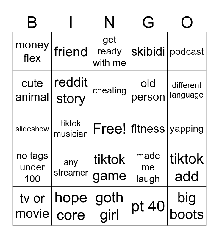 This bingo card has a free space and 24 words: any streamer, hope core, cheating, tv or movie, podcast, money flex, cute animal, friend, fitness, tiktok game, old person, slideshow, made me laugh, tiktok add, reddit story, pt 40, yapping, get ready with me, different language, tiktok musician, big boots, no tags under 100, skibidi and goth girl.
