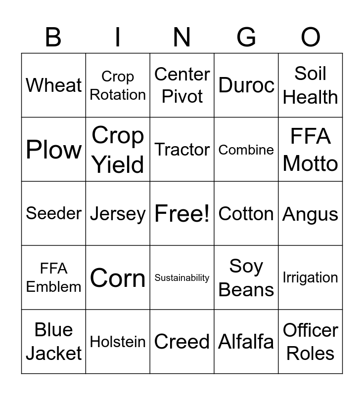 This bingo card has a free space and 24 words: Corn, Holstein, Tractor, Blue Jacket, Soil Health, Wheat, Plow, Crop Rotation, Cotton, Sustainability, Combine, Seeder, Soy Beans, Irrigation, Crop Yield, Alfalfa, Angus, Center Pivot, FFA Motto, Jersey, Officer Roles, FFA Emblem, Duroc and Creed.