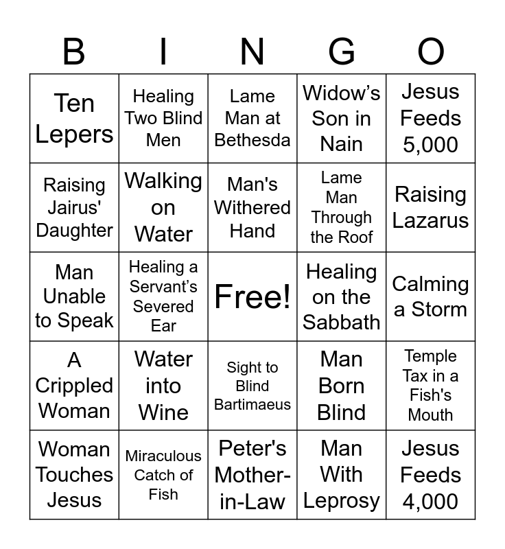 This bingo card has a free space and 25 words: Water into Wine, Peter's Mother-in-Law, Man's Withered Hand, Woman Touches Jesus, Jesus Feeds 5,000, Ten Lepers, Raising Jairus' Daughter, Healing Two Blind Men, Healing on the Sabbath, Sight to Blind Bartimaeus, Lame Man Through the Roof, Man Unable to Speak, Man Born Blind, Temple Tax in a Fish's Mouth, Walking on Water, Healing a Centurion's Servant, Calming a Storm, Lame Man at Bethesda, Raising Lazarus, Healing a Servant’s Severed Ear, Jesus Feeds 4,000, Miraculous Catch of Fish, A Crippled Woman, Widow’s Son in Nain and Man With Leprosy.