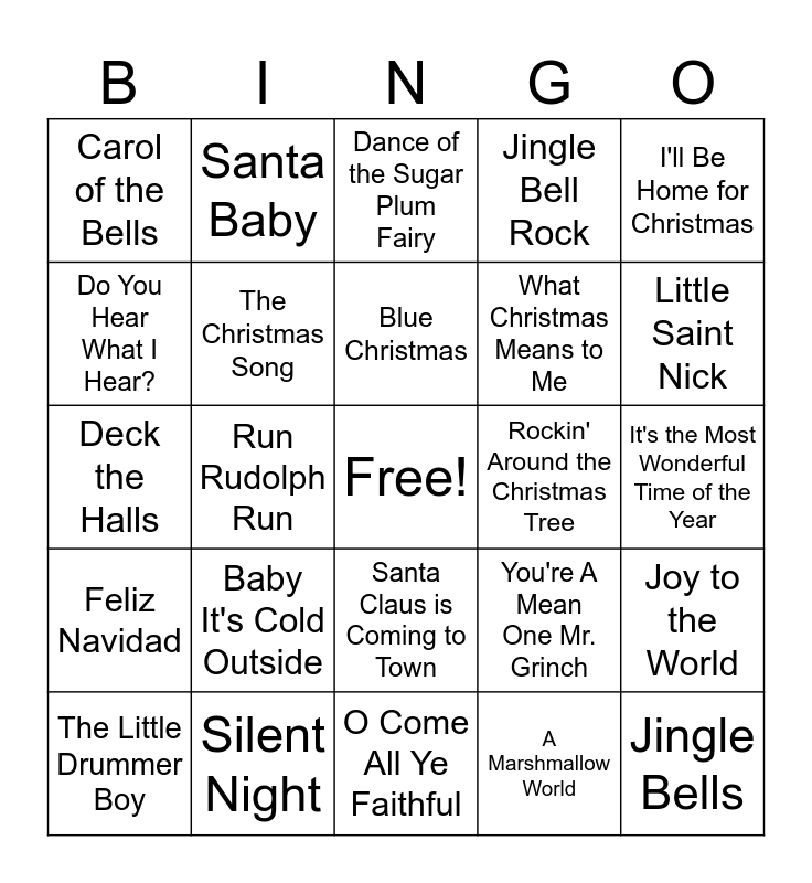 This bingo card has a free space and 39 words: Rudolph the Red Nose Reindeer, White Christmas, Frosty the Snowman, The Christmas Song, The Little Drummer Boy, Santa Claus is Coming to Town, Blue Christmas, Last Christmas, I'll Be Home for Christmas, Feliz Navidad, Run Rudolph Run, Jingle Bell Rock, Jingle Bells, It's the Most Wonderful Time of the Year, Rockin' Around the Christmas Tree, Baby It's Cold Outside, A Holly Jolly Christmas, Carol of the Bells, The First Noel, You're A Mean One Mr. Grinch, Do You Hear What I Hear?, O Come All Ye Faithful, What Christmas Means to Me, Little Saint Nick, Let it Snow! Let it Snow! Let it Snow!, Sleigh Ride, I Want a Hippopotmus For Christmas, Dominick the Donkey, Silver Bells, Santa Baby, 12 Days of Christmas, O Christmas Tree, Dance of the Sugar Plum Fairy, Silent Night, A Marshmallow World, I'm Gettin Nuttin For Christmas, Joy to the World, Deck the Halls and All I Want For Christmas.