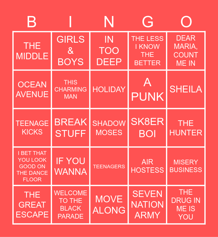 This bingo card has 59 words: AINT IT FUN, WELCOME TO THE BLACK PARADE, DANCE DANCE, I BET THAT YOU LOOK GOOD ON THE DANCE FLOOR, SEVEN NATION ARMY, TAKE ME OUT, THIS CHARMING MAN, REPTILIA, A PUNK, CHOCOLATE, THE LESS I KNOW THE BETTER, THE KILL, OCEAN AVENUE, CHECK YES, JULIET, I WRITE SINS NOT TRAGEDIES, THE MIDDLE, SHADOW MOSES, DEAR MARIA, COUNT ME IN, THE ROCK SHOW, HOLIDAY, SK8ER BOI, IN TOO DEEP, THE GREAT ESCAPE, MISERY BUSINESS, MR BRIGHTSIDE, CHELSEA DAGGER, WHAT YOU KNOW, RUBY, SHEILA, FIT BUT YOU KNOW IT, DANNY NEDELKO, SMOKO, FOUNDATIONS, DREAMING OF YOU, GIRLS & BOYS, JERK IT OUT, KILLING IN THE NAME, BREAK STUFF, KIDS, TEENAGE KICKS, PARKLIFE, IF YOU WANNA, THE HUNTER, CLINT EASTWOOD, PAPER PLANES, PLUG IN BABY, LET'S DANCE TO JOY DIVISION, DAMMIT, TEENAGERS, MOVE ALONG, SUGAR, WE'RE GOING DOWN, I WRITE SINS NOT TRAGEDIES, ALL THE SMALL THINGS, UNDERDOG, WHAT I'VE DONE, AIR HOSTESS, BRING ME TO LIFE, THE DRUG IN ME IS YOU and SCOTTY DOESN'T KNOW.