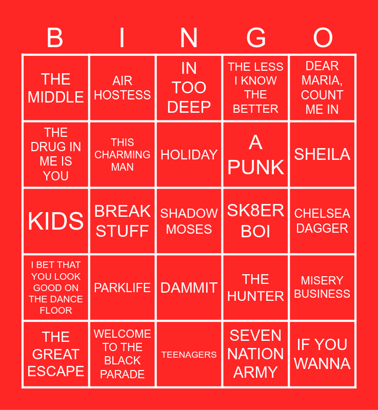 This bingo card has 58 words: AINT IT FUN, WELCOME TO THE BLACK PARADE, DANCE DANCE, I BET THAT YOU LOOK GOOD ON THE DANCE FLOOR, SEVEN NATION ARMY, TAKE ME OUT, THIS CHARMING MAN, REPTILIA, A PUNK, CHOCOLATE, THE LESS I KNOW THE BETTER, THE KILL, OCEAN AVENUE, CHECK YES, JULIET, I WRITE SINS NOT TRAGEDIES, THE MIDDLE, SHADOW MOSES, DEAR MARIA, COUNT ME IN, THE ROCK SHOW, HOLIDAY, SK8ER BOI, IN TOO DEEP, THE GREAT ESCAPE, MISERY BUSINESS, MR BRIGHTSIDE, CHELSEA DAGGER, WHAT YOU KNOW, RUBY, SHEILA, FIT BUT YOU KNOW IT, DANNY NEDELKO, SMOKO, FOUNDATIONS, DREAMING OF YOU, GIRLS & BOYS, JERK IT OUT, KILLING IN THE NAME, BREAK STUFF, KIDS, TEENAGE KICKS, PARKLIFE, IF YOU WANNA, THE HUNTER, CLINT EASTWOOD, PAPER PLANES, PLUG IN BABY, LET'S DANCE TO JOY DIVISION, DAMMIT, TEENAGERS, MOVE ALONG, SUGAR, WE'RE GOING DOWN, ALL THE SMALL THINGS, UNDERDOG, WHAT I'VE DONE, AIR HOSTESS, BRING ME TO LIFE, THE DRUG IN ME IS YOU and SCOTTY DOESN'T KNOW.