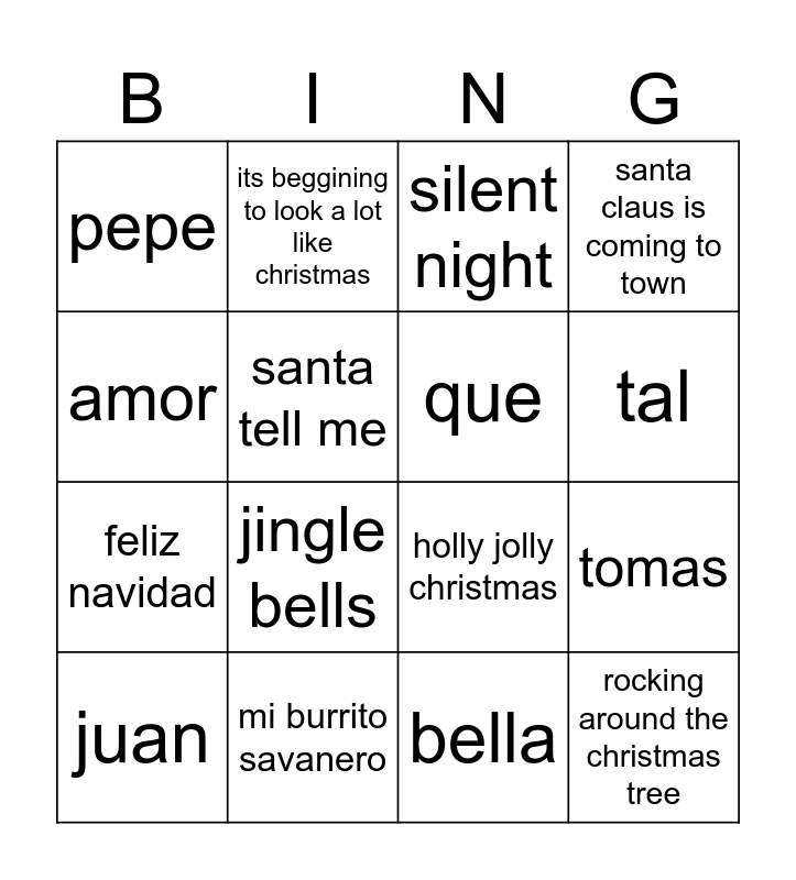 This bingo card has 28 words: all i want for christmas is you, last christmas, feliz navidad, jingle bell rock, santa tell me, silent night, its beggining to look a lot like christmas, rocking around the christmas tree, mi burrito savanero, frosty the snowman, holly jolly christmas, santa claus is coming to town, rudolph the red nose raindeer, let it snow, let it snow, let it snow!, jingle bells, mistletoe, hola, que, tal, estas, pepe, manu, juan, tomas, bella, flor, amor and de primavera.