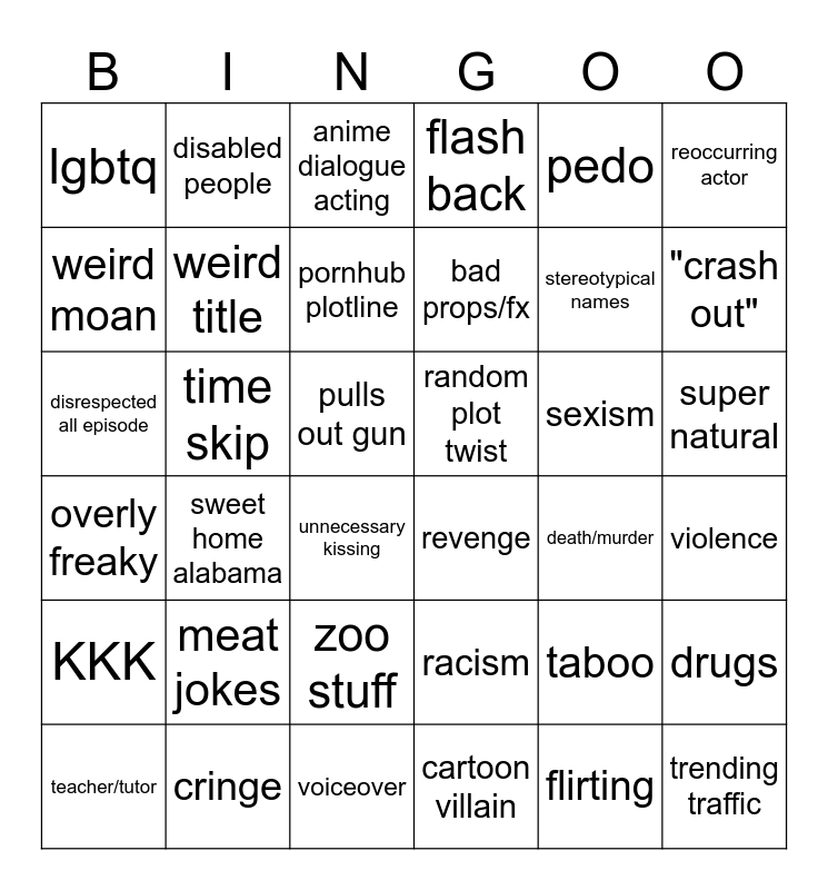 This bingo card has 36 words: racism, zoo stuff, cartoon villain, weird moan, overly freaky, random plot twist, weird title, voiceover, pedo, taboo, "crash out", flash back, drugs, time skip, bad props/fx, lgbtq, KKK, sexism, disrespected all episode, anime dialogue acting, pulls out gun, sweet home alabama, revenge, unnecessary kissing, death/murder, disabled people, stereotypical names, cringe, pornhub plotline, reoccurring actor, trending traffic, teacher/tutor, violence, super natural, meat jokes and flirting.