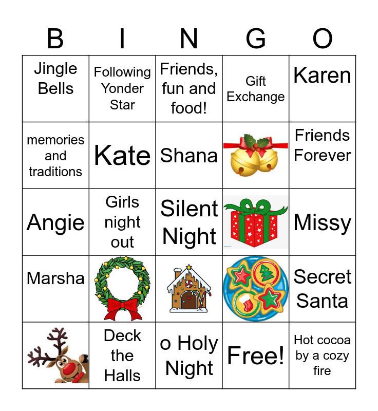 This bingo card has 9 images and 21 words: Deck the Halls, O come let us adore Him!, Girls night out, Jingle Bells, Friends, fun and food!, Kate, o Holy Night, Missy, Silent Night, Free!, Hot cocoa by a cozy fire, Friends Forever, Feliz Navidad, Marsha, Karen, Angie, Following Yonder Star, memories and traditions, Gift Exchange, Secret Santa and Shana.