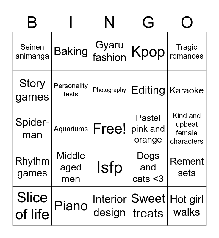 This bingo card has a free space and 24 words: Middle aged men, Piano, Photography, Slice of life, Tragic romances, Seinen animanga, Story games, Baking, Pastel pink and orange, Isfp, Editing, Spider-man, Dogs and cats <3, Rement sets, Personality tests, Sweet treats, Kind and upbeat female characters, Gyaru fashion, Karaoke, Aquariums, Hot girl walks, Rhythm games, Kpop and Interior design.