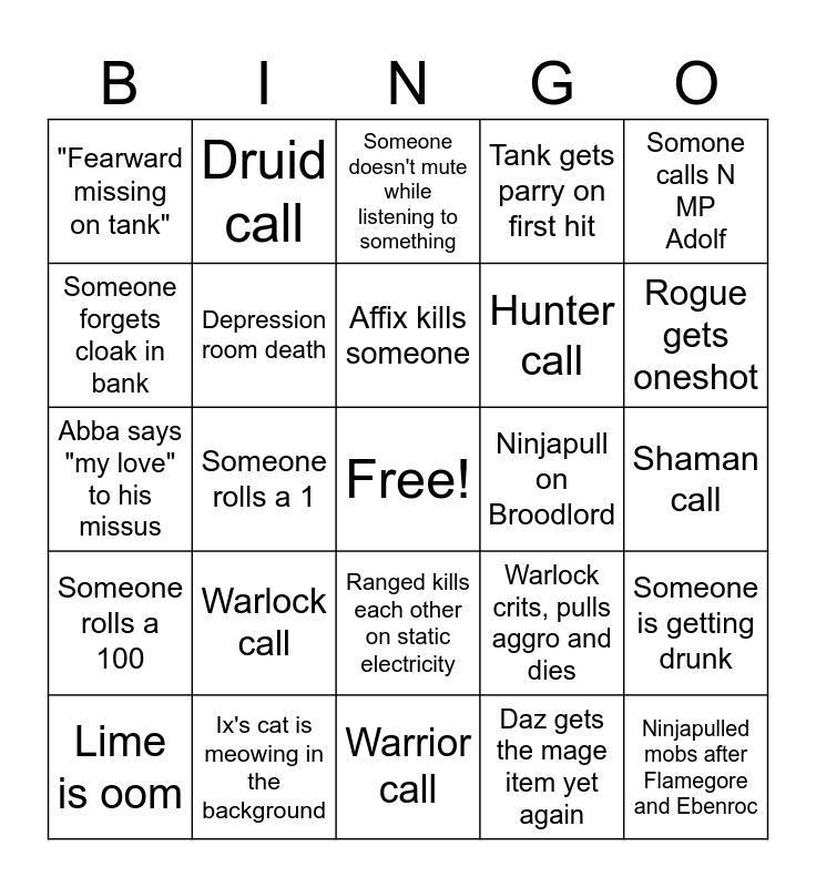 This bingo card has a free space and 35 words: "I'm stunededed", NMP doesn't unboon, Someone needs a boon, Depression room death, Ranged kills each other on static electricity, Tank gets parry on first hit, Someone forgets cloak in bank, Ix finally gets her dagger, Affix kills someone, Moomin chases someone with green affix, Abba says "my love" to his missus, Somone calls NMP Adolf, "Happy with that", "I'm a dwuid", "Fearward missing on tank", Ninjapull on Broodlord, Daz gets the mage item yet again, Someone rolls a 1, Someone rolls a 100, Ninjapulled mobs after Flamegore and Ebenroc, Warlock crits, pulls aggro and dies, Lime is oom, Someone is getting drunk, Ix's cat is meowing in the background, Someone doesn't mute while listening to something, Rogue gets oneshot, Mage call, Priest call, Hunter call, Shaman call, Rogue call, Warrior call, Warlock call, Druid call and Kenneth and the boys.