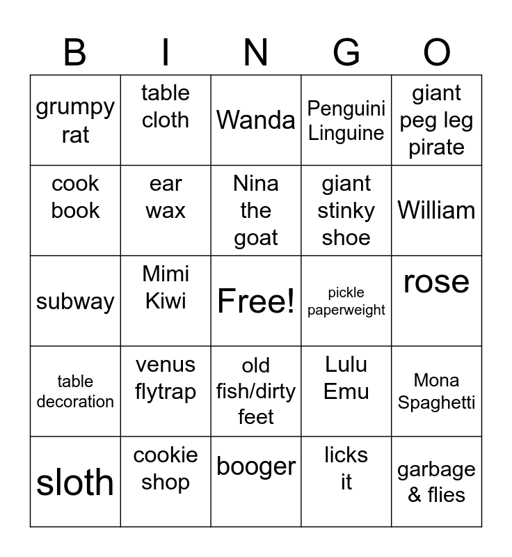 This bingo card has a free space and 24 words: venus flytrap, cookie shop, Nina the goat, sloth, giant peg leg pirate, grumpy rat, cook book, table cloth, pickle paperweight, old fish/dirty feet, giant stinky shoe, subway, Lulu Emu, Mona Spaghetti, ear wax, licks it, rose, Wanda, William, Mimi Kiwi, garbage & flies, table decoration, Penguini Linguine and booger.