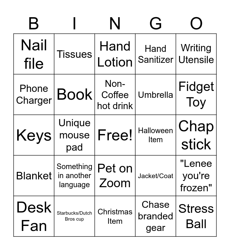 This bingo card has a free space and 26 words: Pet on Zoom, Chase branded gear, Non-Coffee hot drink, Starbucks/Dutch Bros cup, Writing Utensile, Nail file, Phone Charger, Tissues, Chap stick, Jacket/Coat, Umbrella, Keys, "Lenee you're frozen", Desk Fan, Unique mouse pad, Sports team item, Hand Sanitizer, Blanket, Hand Lotion, Stress Ball, Fidget Toy, Christmas Item, Halloween Item, Something in another language, Book and Something travel related.