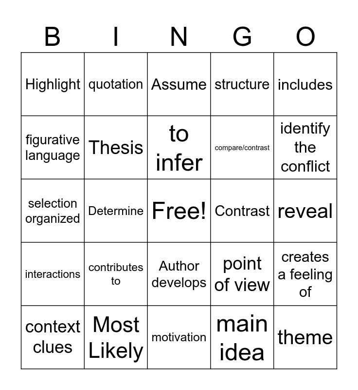This bingo card has a free space and 30 words: Most Likely, Best helps, Determine, summarize, Highlight, Assume, Thesis, Author develops, Contrast, motivation, reveal, theme, main idea, best expresses, identify the conflict, setting influence, point of view, interactions, contributes to, includes, selection organized, support the idea, quotation, compare/contrast, figurative language, structure, creates a feeling of, context clues, to infer and reader insight.
