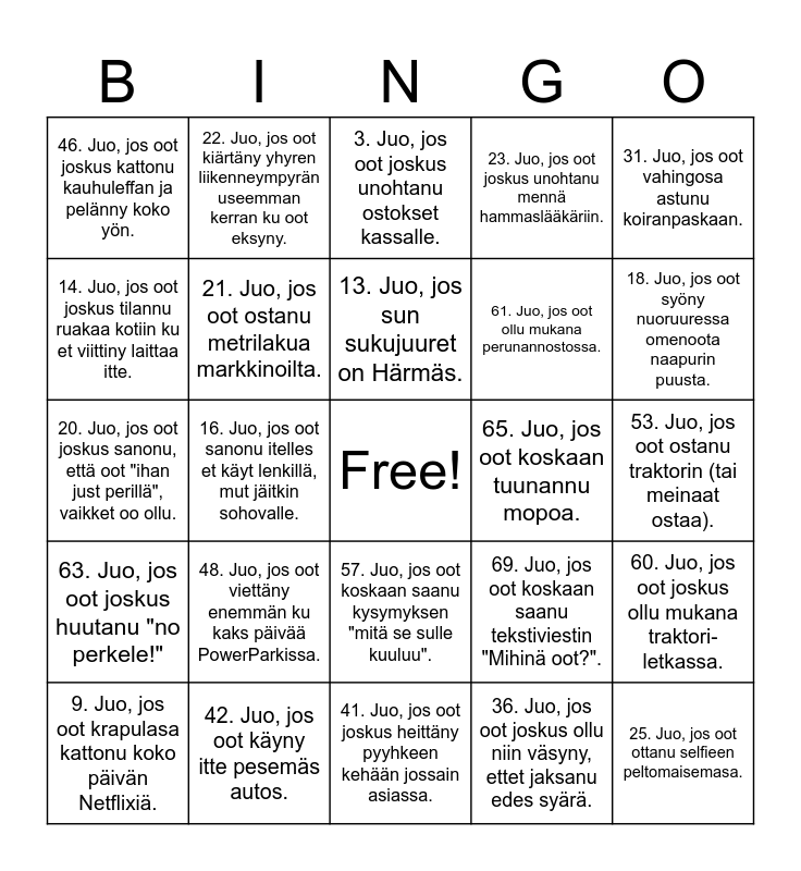 This bingo card has a free space and 74 words: 1. Juo, jos oot käyny Seinäjoen Tangomarkkinoolla., 2. Juo, jos oot käyny markkinoolla tänä vuonna., 3. Juo, jos oot joskus unohtanu ostokset kassalle., 4. Juo, jos oot kiroillu liikentees., 5. Juo, jos oot joskus hävittäny autos parkkipaikalle., 6. Juo, jos oot käyttäny lausetta: "niin mutta ku...", 7. Juo, jos oot pannu väärälle ihmiselle viestin., 8. Juo, jos oot joskus nukahtanu sohovalle., 9. Juo, jos oot krapulasa kattonu koko päivän Netflixiä., 10. Juo, jos oot joskus hävittäny puhelimes., 11. Juo, jos oot unohtanu synttärit., 12. Juo, jos oot hukannu avaamet., 13. Juo, jos sun sukujuuret on Härmäs., 14. Juo, jos oot joskus tilannu ruakaa kotiin ku et viittiny laittaa itte., 15. Juo, jos oot ostanu jotaki turhaa verkkokaupasta., 16. Juo, jos oot sanonu itelles et käyt lenkillä, mut jäitkin sohovalle., 17. Juo, jos oot joskus loukannu ittelles urheillessas., 18. Juo, jos oot syöny nuoruuressa omenoota naapurin puusta., 19. Juo, jos oot joskus sanonu jollekin "älä rupia"., 20. Juo, jos oot joskus sanonu, että oot "ihan just perillä", vaikket oo ollu., 21. Juo, jos oot ostanu metrilakua markkinoilta., 22. Juo, jos oot kiärtäny yhyren liikenneympyrän useemman kerran ku oot eksyny., 23. Juo, jos oot joskus unohtanu mennä hammaslääkäriin., 24. Juo, jos oot joskus lähteny töistä vähä aikaasee., 25. Juo, jos oot ottanu selfieen peltomaisemasa., 26. Juo, jos oot yrittäny tehdä vaikutuksen somessa., 27. Juo, jos oot joskus hoksannu jonku asian vasta monta vuatta myähemmin., 28. Juo, jos oot joskus polttanu kätes kiukaasee., 29. Juo, jos oot jääny kiinni valehtelemises., 30. Juo, jos oot joskus nukahtanu väärän aikaan., 31. Juo, jos oot vahingosa astunu koiranpaskaan., 32. Juo, jos oot eksyny mettäretkellä., 33. Juo, jos oot joskus leiponu piirakan, joka meni piälee., 34. Juo, jos oot unohtanu jonku kyytistä., 35. Juo, jos oot laulanu karaokea viimeisen kuukaure aikana., 36. Juo, jos oot joskus ollu niin väsyny, ettet jaksanu edes syärä., 37. Juo, jos oot viettäny juhannuksen mökillä., 38. Juo, jos oot joskus pukenu väärät kengät jalakoohi., 39. Juo, jos oot käyny ainakin kerran elämässäsi Ilmajoella., 40. Juo, jos oot juonu kaverin juomaa iliman lupaa., 41. Juo, jos oot joskus heittäny pyyhkeen kehään jossain asiassa., 42. Juo, jos oot käyny itte pesemäs autos., 43. Juo, jos oot koskaan nähny painajaasta., 44. Juo, jos oot joskus nukkunu pommiin tärkiänä päivänä., 45. Juo, jos oot koskaan käyttäny sanaa "komia"., 46. Juo, jos oot joskus kattonu kauhuleffan ja pelänny koko yön., 47. Juo, jos oot väsyksis., 48. Juo, jos oot viettäny enemmän ku kaks päivää PowerParkissa., 49. Juo, jos oot joskus tehny ruakaostokset pöhönäs., 50. Juo, jos oot ollu häissä tänä vuonna., 51. Juo, jos oot syöny muikkuja festariilla., 52. Juo, jos oot joskus ajanu Härmän katuja läpi ilman selkeetä määränpäätä., 53. Juo, jos oot ostanu traktorin (tai meinaat ostaa)., 54. Juo, jos oot joskus pyöräilly lakeudella ja tuuli on meinannu kaataa., 55. Juo, jos oot joskus valittanu säästä, vaikka et itte asialle mitään voi., 56. Juo, jos oot tilannu "makkaraperunat" rilliltä., 57. Juo, jos oot koskaan saanu kysymyksen "mitä se sulle kuuluu"., 58. Juo, jos oot sanonu "tämä tästä ny"., 59. Juo, jos oot ollu yhen illan aikana kolmessa eri kylässä., 60. Juo, jos oot joskus ollu mukana traktori-letkassa., 61. Juo, jos oot ollu mukana perunannostossa., 62. Juo, jos oot koskaan sanonu "ei voi mitää"., 63. Juo, jos oot joskus huutanu "no perkele!", 64. Juo, jos oot joskus ihmetellyt, mitä naapurit puuhaa., 65. Juo, jos oot koskaan tuunannu mopoa., 66. Juo, jos oot joskus kuullu "mahtavaa porukkaa täälä meidän kylällä"., 67. Juo, jos oot kuullu tarinoita "tienaamisesta" jo lapsena., 68. Juo, jos oot joskus laulanu karaokea liian kovaa., 69. Juo, jos oot koskaan saanu tekstiviestin "Mihinä oot?"., 71. Juo, jos oot ikinä valittanu "koko ajan sataa vettä"., 72. Juo, jos oot sanonu "oota vähä"., 73. Juo, jos oot nähny hiekkatien täynnä kuoppia., 74. Juo, jos oot joskus rakentanu linnunpöntön. and 75. Juo, jos oot koskaan käyttäny sanaa "klapi"..