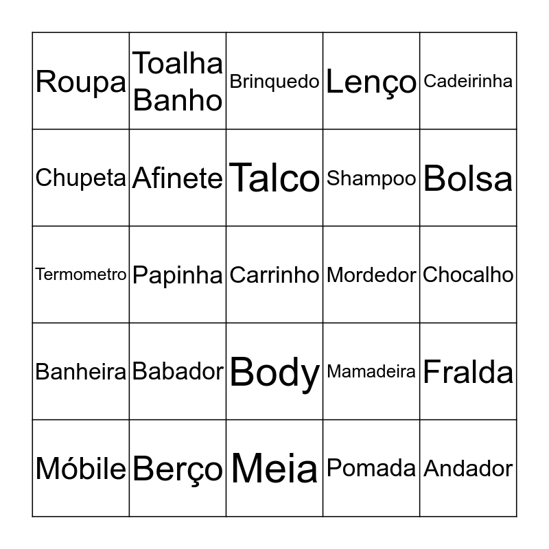 This bingo card has 25 words: Babador, Meia, Talco, Móbile, Cadeirinha, Roupa, Chupeta, Toalha Banho, Mordedor, Body, Shampoo, Termometro, Mamadeira, Fralda, Afinete, Andador, Chocalho, Brinquedo, Bolsa, Papinha, Carrinho, Berço, Banheira, Lenço and Pomada.