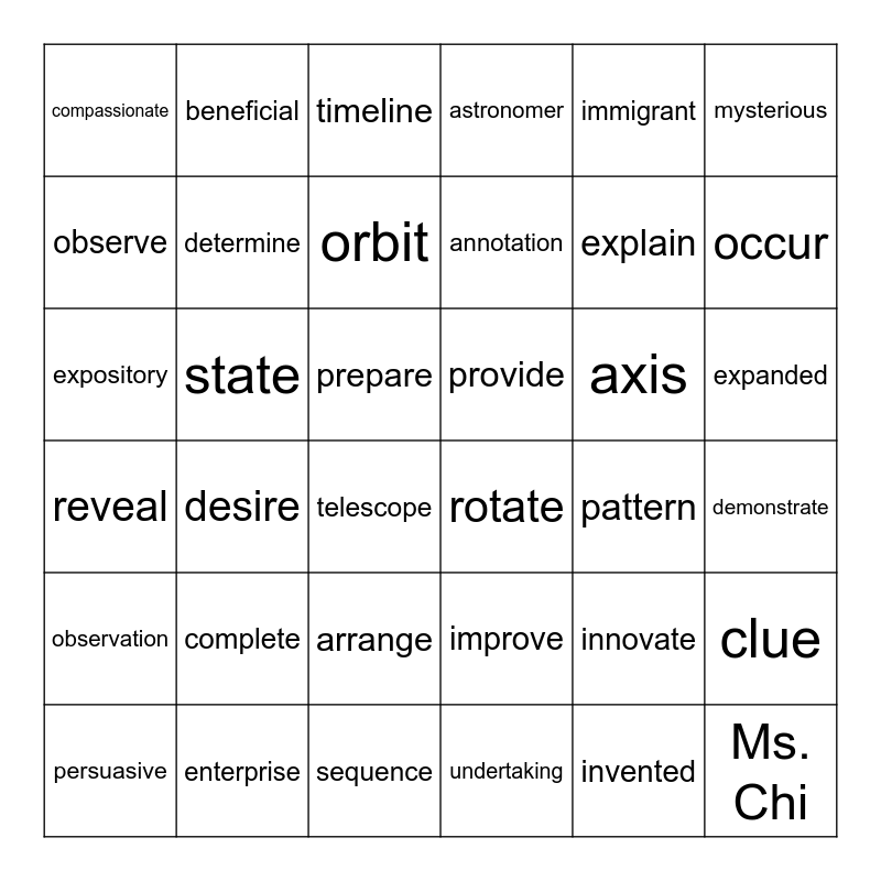 This bingo card has 36 words: improve, arrange, undertaking, observe, reveal, provide, determine, sequence, immigrant, innovate, occur, astronomer, clue, state, annotation, compassionate, observation, axis, expository, timeline, prepare, desire, rotate, telescope, pattern, beneficial, explain, enterprise, orbit, mysterious, Ms. Chi, persuasive, demonstrate, expanded, complete and invented.