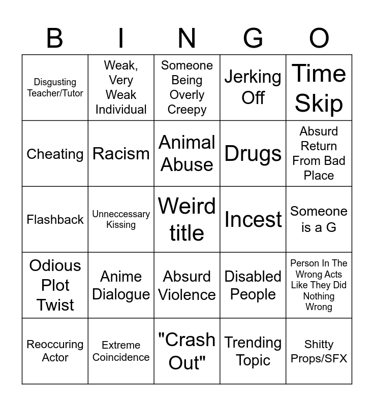 This bingo card has a free space and 35 words: Bizarre Family Dynamic, Supernatural Occurance, Character Disrespected All Episode Long, Racism, Absurd Violence, Jerking Off, Cheating, Unrealistic Life Lesson, Animal Abuse, Anime Villain, Flashback, Time Skip, Revenge, Pulls Out Gun, Disgusting Teacher/Tutor, Incest, Trending Topic, Unneccessary Kissing, Odious Plot Twist, Shitty Props/SFX, Disabled People, Reoccuring Actor, Person In The Wrong Acts Like They Did Nothing Wrong, Extreme Coincidence, Someone Being Overly Creepy, Absurd Return From Bad Place, Offensive For No Reason, LGBTQ, Drugs, Someone is a G, Bullying, "Crash Out", Anime Dialogue, Weak, Very Weak Individual and Sexism.