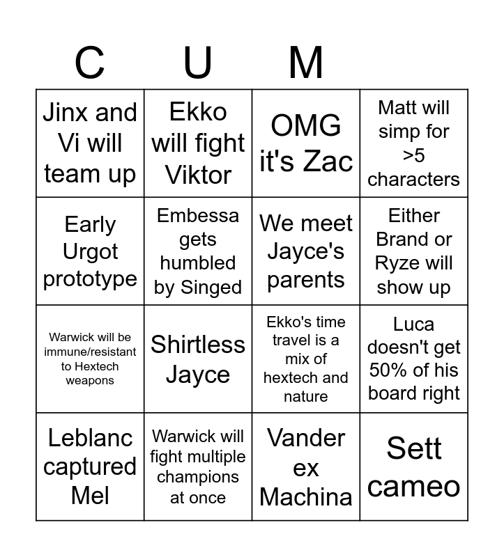This bingo card has 16 words: Warwick will fight multiple champions at once, Luca doesn't get 50% of his board right, OMG it's Zac, Jinx and Vi will team up, Warwick will be immune/resistant to Hextech weapons, Ekko will fight Viktor, Ekko's time travel is a mix of hextech and nature, Vander ex Machina, Early Urgot prototype, Embessa gets humbled by Singed, Leblanc captured Mel, Matt will simp for >5 characters, Shirtless Jayce, Either Brand or Ryze will show up, We meet Jayce's parents and Sett cameo.
