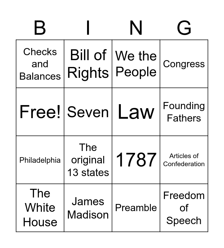 This bingo card has 16 words: James Madison, Articles of Confederation, We the People, Checks and Balances, Philadelphia, Bill of Rights, 1787, Preamble, Free!, Seven, The White House, Congress, The original 13 states, Founding Fathers, Law and Freedom of Speech.