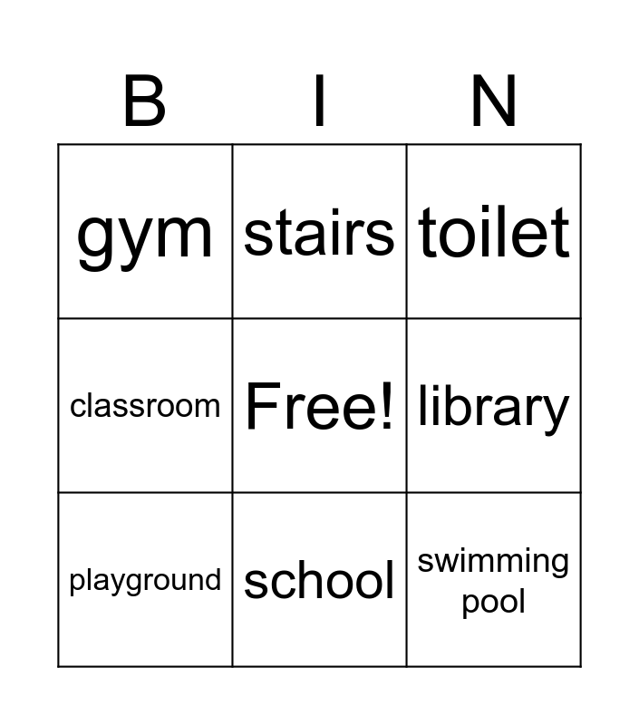 This bingo card has a free space and 8 words: library, toilet, stairs, playground, gym, swimming pool, classroom and school.