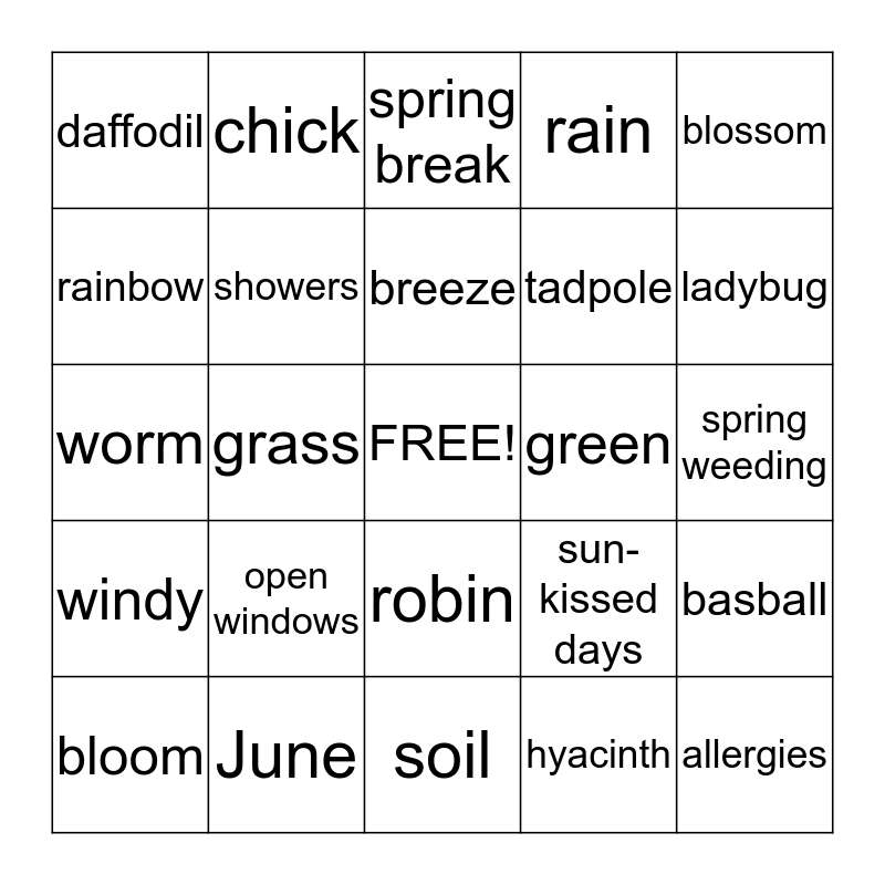 This bingo card has a free space and 24 words: open windows, June, breeze, bloom, blossom, daffodil, rainbow, chick, green, robin, tadpole, worm, sun-kissed days, basball, showers, hyacinth, spring weeding, spring break, ladybug, grass, allergies, windy, rain and soil.