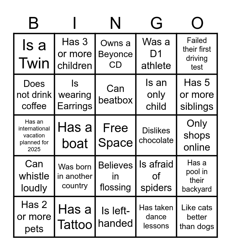This bingo card has a free space and 29 words: Has 2 or more pets, Has recently binge watched an entire TV series, Has a boat, is living their New Year's resolution, Is a Twin, Owns a Beyonce CD, Is wearing Earrings, Was born in another country, Dislikes chocolate, Has a Tattoo, Only shops online, Like cats better than dogs, Is left-handed, Has taken dance lessons, Has 5 or more siblings, Can play an instrument, Believes in flossing, Can whistle loudly, Failed their first driving test, Has an international vacation planned for 2025, Is afraid of spiders, Has the same birthday month as you, Is an only child, Does not drink coffee, Was a D1 athlete, Has 3 or more children, Has a pool in their backyard, Can beatbox and Believes in the Matrix.