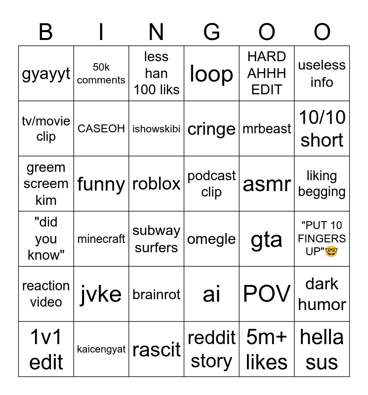 This bingo card has 36 words: ai, brainrot, reddit story, tv/movie clip, "did you know", podcast clip, CASEOH, rascit, HARD AHHH EDIT, POV, 10/10 short, loop, dark humor, funny, cringe, gyayyt, reaction video, asmr, greem screem kim, less han 100 liks, roblox, minecraft, omegle, subway surfers, gta, 50k comments, mrbeast, kaicengyat, ishowskibi, useless info, hella sus, 1v1 edit, "PUT 10 FINGERS UP"🤓, liking begging, jvke and 5m+ likes.