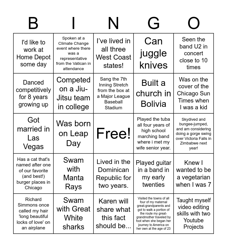 This bingo card has a free space and 24 words: Swam with Manta Rays, Swam with Great White sharks, Sang the 7th Inning Stretch from the box at a Major League Baseball Stadium, Richard Simmons once called my hair 'long beautiful locks of love' on an airplane, Seen the band U2 in concert close to 10 times, I'd like to work at Home Depot some day, Danced competitively for 8 years growing up, Spoken at a Climate Change event where there was a representative from the Vatican in attendance, Played the tuba all four years of high school marching band where i met my wife senior year., Lived in the Dominican Republic for two years., Built a church in Bolivia, Got married in Las Vegas, Played guitar in a band in my early twenties, Knew I wanted to be a vegetarian when I was 7, Competed on a Jiu-Jitsu team in college, Visited the towns of all four of my maternal great-grandparents and got to walk a portion of the route my great-grandmother traveled by foot when she began her journey to America on her own at the age of 23, Skydived and bungee-jumped, and am considering doing a gorge swing over Victoria Falls in Zimbabwe next year!, I’ve lived in all three West Coast states!, Was on the cover of the Chicago Sun Times when I was a kid, Was born on Leap Day, Taught myself video editing skills with two Youtube Projects, Has a cat that's named after one of our favorite (and best!) burger places in Chicago, Can juggle knives and Karen will share what this fact should be....
