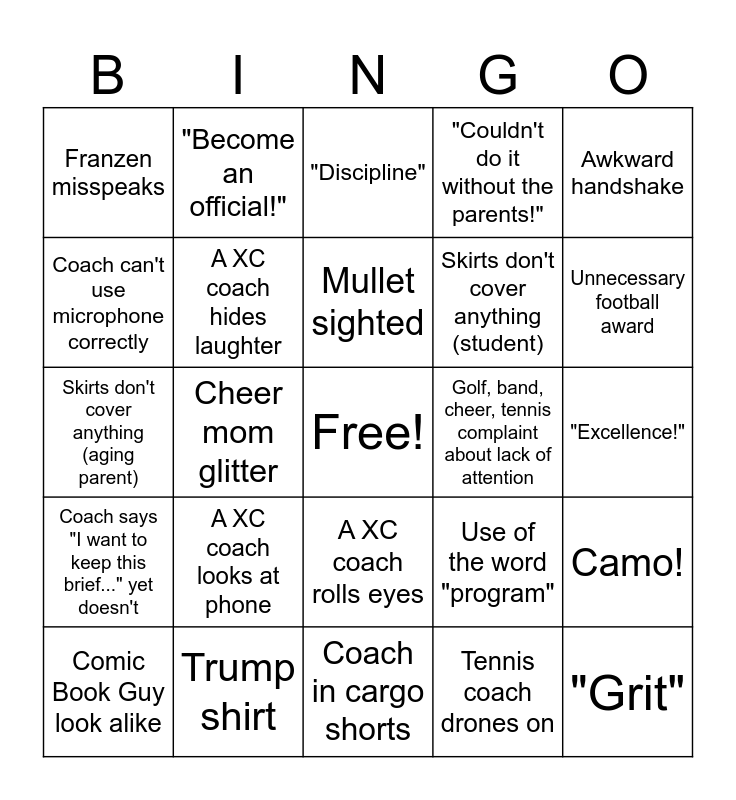 This bingo card has a free space and 26 words: A XC coach rolls eyes, Tennis coach drones on, Mullet sighted, Trump shirt, Awkward handshake, Franzen misspeaks, Coach can't use microphone correctly, "Become an official!", "Excellence!", Use of the word "program", Skirts don't cover anything (student), Skirts don't cover anything (aging parent), Camo!, Comic Book Guy look alike, Cheer mom glitter, Franzen still talking, "Couldn't do it without the parents!", Coach says "I want to keep this brief..." yet doesn't, "Discipline", "Grit", Unnecessary football award, Coach in cargo shorts, Golf, band, cheer, tennis complaint about lack of attention, A XC coach looks at phone, A XC coach hides laughter and "Hold your applause to the end," no one does.