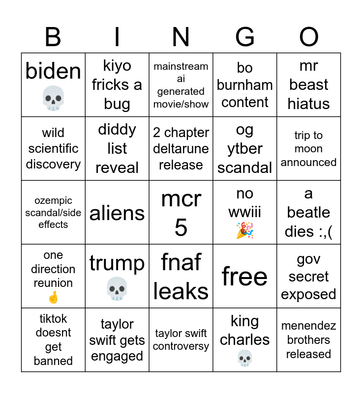 This bingo card has 25 words: trump 💀, taylor swift controversy, 2 chapter deltarune release, tiktok doesnt get banned, mr beast hiatus, biden 💀, wild scientific discovery, kiyo fricks a bug, no wwiii 🎉, fnaf leaks, og ytber scandal, ozempic scandal/side effects, free, gov secret exposed, diddy list reveal, menendez brothers released, a beatle dies :,(, mainstream ai generated movie/show, trip to moon announced, aliens, mcr 5, taylor swift gets engaged, one direction reunion 🤞, bo burnham content and king charles 💀.