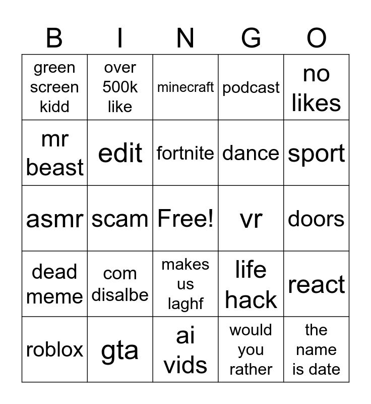 This bingo card has a free space and 24 words: com disalbe, gta, fortnite, roblox, no likes, green screen kidd, mr beast, over 500k like, vr, makes us laghf, dance, asmr, life hack, react, edit, would you rather, doors, minecraft, sport, scam, the name is date, dead meme, podcast and ai vids.