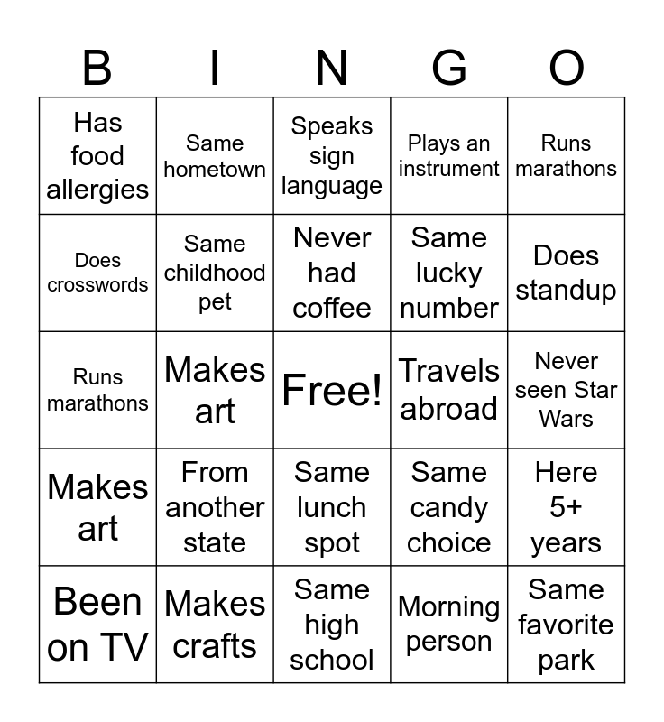 This bingo card has a free space and 126 words: Plays an instrument, Speaks 3+ languages, Has pets, Same zodiac sign, Here 5+ years, Stage experience, Makes art, From another state, Morning person, Coffee lover, Decorates desk, Museum member, Volunteers locally, Commutes by bike, Has food allergies, Collects something, Makes crafts, Been in all offices, Night owl, Loves karaoke, Gardens, Runs marathons, Loves winter, Same birth month, Can juggle, Never had coffee, Plays an instrument, Speaks 3+ languages, Has pets, Same zodiac sign, Here 5+ years, Stage experience, Makes art, From another state, Morning person, Coffee lover, Decorates desk, Museum member, Volunteers locally, Commutes by bike, Has food allergies, Collects something, Makes crafts, Been in all offices, Night owl, Loves karaoke, Gardens, Runs marathons, Loves winter, Same birth month, Can juggle, Never had coffee, Loves sci-fi, Born locally, Left-handed, Does yoga, Bakes, Same favorite color, Has twins, Travels abroad, Does crosswords, Same shoe size, Hates cilantro, Works remotely, Been to Antarctica, Plays video games, Writes poetry, Same lunch spot, Allergic to cats, Never seen Star Wars, Same college major, Loves spicy food, Builds furniture, Same first concert, Has tattoos, Plays chess, Makes music, Same favorite book, Rock climbs, Been skydiving, Meditates daily, Keeps a journal, Same subway stop, Speaks Japanese, Been on TV, Same favorite tea, Drives electric car, Has chickens, Same high school, Makes jewelry, Does improv, Same coffee order, Hikes regularly, Same childhood pet, Sews clothes, Speaks sign language, Same dream job, Loves musicals, Same phobia, Makes ceramics, Same favorite park, Paints portraits, Same candy choice, Grows herbs, Makes films, Same sandwich shop, Dances salsa, Same favorite pie, Does standup, Same snack choice, Plays tennis, Same movie genre, Reads tarot, Same vacation spot, Does martial arts, Speaks French, Same ice cream, Makes kombucha, Same pizza topping, Plays in band, Same lucky number, Does photography, Same allergies, Makes bread, Same hometown and Loves podcasts.