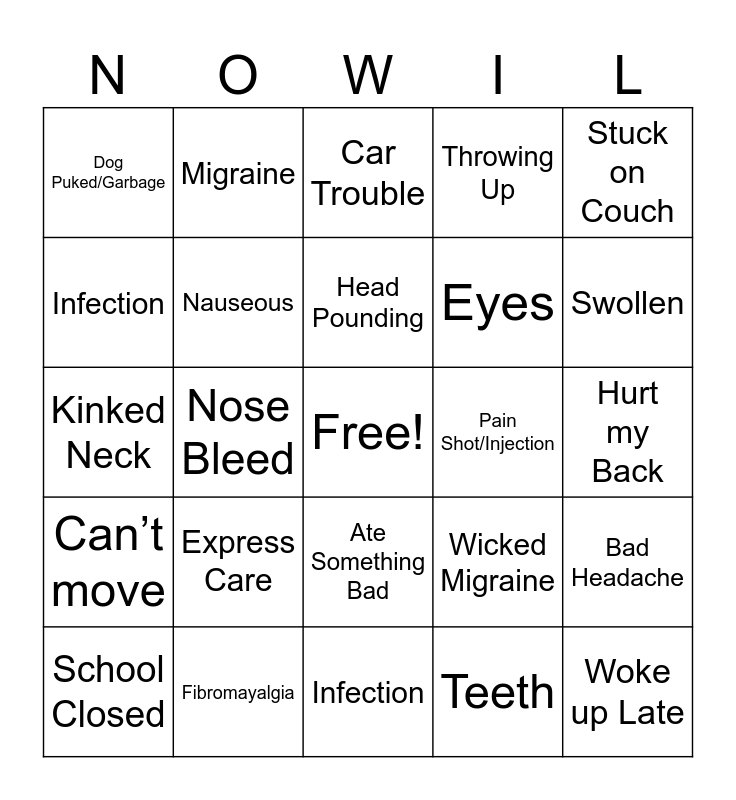 This bingo card has a free space and 47 words: Antibiotics, Woke up Late, Kid Sick, Infection, Express Care, Appointment, Migraine, Fever, Infection, Sinuses, Nauseous, Throwing Up, Bad Headache, Wicked Migraine, Killer Headache, Nasty Headache, Head Pounding, Pain Shot/Injection, In a lot of pain, Stuck on Couch, Nose Bleed, Teeth, Dog Puked/Garbage, Eyes, Surgery, Swollen, School Closed, No one to watch Kids, Ate Something Bad, Can’t move, Bank issues, Rough morning, Sore Throat, Feeling Shitty, Running Late, Fibromayalgia, Hurt my Back, Heavy Duty Muscle Relaxers, Doctor’s Note, Pulled Muscle, Muscle Spasm, Car Trouble, Kinked Neck, Affected/Can’t Drive, Barely Walk, Dizzy and Trouble Sleeping.