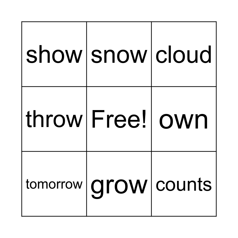 This bingo card has a free space and 14 words: blowing, flow, tomorrow, snow, throw, counts, around, found, grow, show, ground, own, cloud and SOUND.