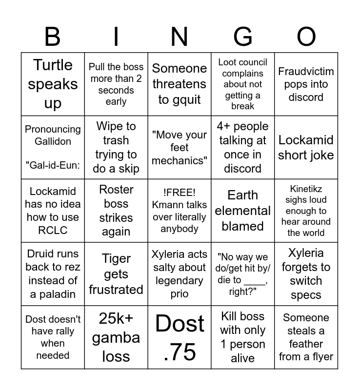 This bingo card has a free space and 39 words: Get knocked off ledge by the molten lord, Accusing people of not watching videos, Cinnamon disagrees with anybody and won't let it go, Wipe to trash trying to do a skip, Dost doesn't have rally when needed, Xyleria acts salty about legendary prio, "Move your feet mechanics", You can hear Tigers fan in discord, Fraudvictim pops into discord, Druid runs back to rez instead of a paladin, Roster boss strikes again, Loot council complains about not getting a break, Someone steals a feather from a flyer, Kinetikz sighs loud enough to hear around the world, Earth elemental blamed, Tiger gets frustrated, Stoned is a buster, Turtle speaks up, Pulling first boss with less than 25 people, "No way we do/get hit by/ die to ____, right?", Pronouncing Gallidon "Gal-id-Eun:, Dost .75, 4+ people talking at once in discord, Lockamid short joke, Shannox passes us by, we have to wait, THE OLD DICE is mentioned, Translation needed mid-raid, Kinetikz mic muted for who knows how long, Non-tank taunts the boss and dies, Pull the boss more than 2 seconds early, Tiger reminds Kinetikz he was right that 1 time, Progression on a boss we've 1 shot before, Someone threatens to gquit, 25k+ gamba loss, Kill boss with only 1 person alive, Wipe to a boss with 1% hp, Xyleria forgets to switch specs, Lockamid has no idea how to use RCLC and Rytiou tries asking for a CD in the most words possible and dies before getting to the point.