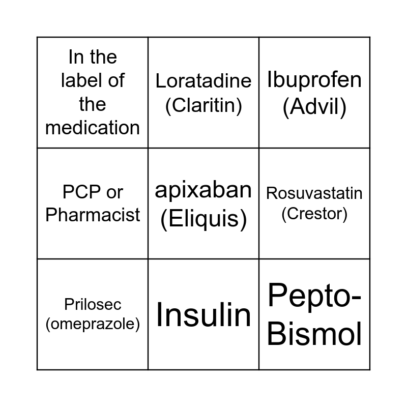 This bingo card has a free space and 8 words: Rosuvastatin (Crestor), Ibuprofen (Advil), Loratadine (Claritin), Prilosec (omeprazole), In the label of the medication, Pepto-Bismol, PCP or Pharmacist and Insulin.