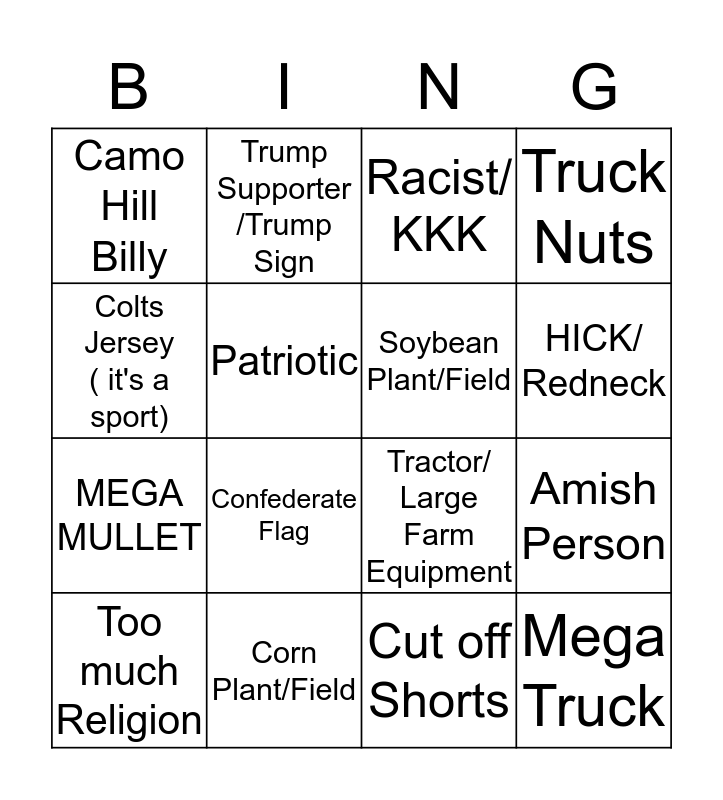 This bingo card has 16 words: Corn Plant/Field, Amish Person, Racist/ KKK, Camo Hill Billy, MEGA MULLET, Trump Supporter /Trump Sign, Tractor/ Large Farm Equipment, Cut off Shorts, Colts Jersey ( it's a sport), Patriotic, Too much Religion, Truck Nuts, Confederate Flag, HICK/ Redneck, Soybean Plant/Field and Mega Truck.