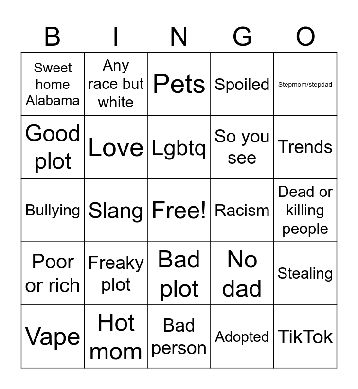 This bingo card has a free space and 24 words: Freaky plot, Hot mom, Lgbtq, Vape, Stepmom/stepdad, Sweet home Alabama, Good plot, Any race but white, Racism, Bad plot, So you see, Bullying, No dad, Stealing, Love, Adopted, Dead or killing people, Pets, Trends, Slang, TikTok, Poor or rich, Spoiled and Bad person.