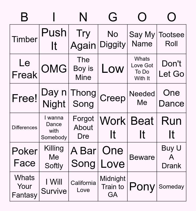 This bingo card has 36 words: One Love, A Bar Song, Midnight Train to GA, Le Freak, Differences, Creep, OMG, California Love, Say My Name, Beware, Don't Let Go, No Diggity, Buy U A Drank, Day n Night, Low, Timber, Poker Face, Needed Me, Free!, Try Again, Thong Song, I wanna Dance with Somebody, Work It, Forgot About Dre, Beat It, Push It, Whats Love Got To Do With It, I Will Survive, The Boy is Mine, Tootsee Roll, Someday, Whats Your Fantasy, Run It, One Dance, Killing Me Softly and Pony.