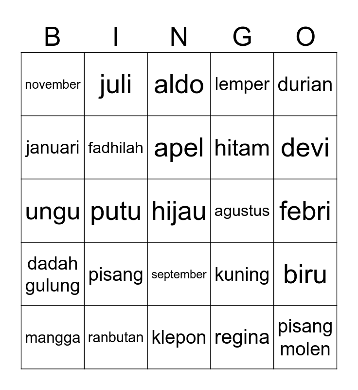 This bingo card has a free space and 24 words: pisang, ranbutan, apel, mangga, durian, november, januari, juli, agustus, september, hitam, ungu, kuning, biru, fadhilah, regina, febri, aldo, devi, putu, pisang molen, dadah gulung, lemper and klepon.