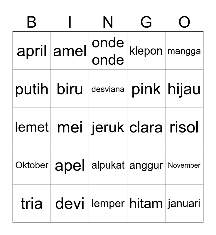 This bingo card has a free space and 24 words: apel, devi, desviana, tria, mangga, april, putih, amel, clara, alpukat, pink, lemet, anggur, November, biru, hitam, risol, onde onde, hijau, mei, januari, Oktober, klepon and lemper.