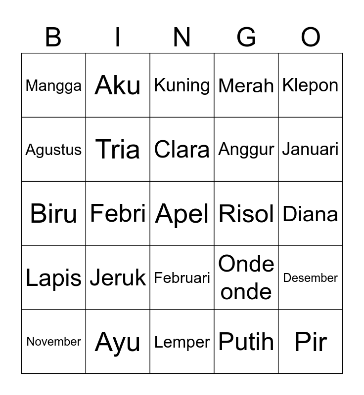 This bingo card has a free space and 24 words: Jeruk, Ayu, Clara, November, Klepon, Mangga, Agustus, Aku, Risol, Februari, Anggur, Biru, Onde onde, Desember, Tria, Putih, Diana, Kuning, Januari, Febri, Pir, Lapis, Merah and Lemper.