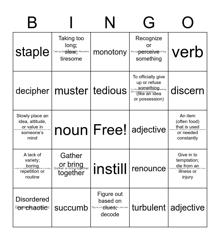 This bingo card has 10 images, a free space and 24 words: Disordered or chaotic, Gather or bring together, tedious, turbulent, verb, staple, Taking too long; slow; tiresome, monotony, adjective, An item (often food) that is used or needed constantly, Slowly place an idea, attitude, or value in someone’s mind, muster, renounce, Give in to temptation; die from an illness or injury, decipher, succumb, Figure out based on clues; decode, Recognize or perceive something, discern, A lack of variety; boring repetition or routine, noun, instill, To officially give up or refuse something (like an idea or possession) and adjective.